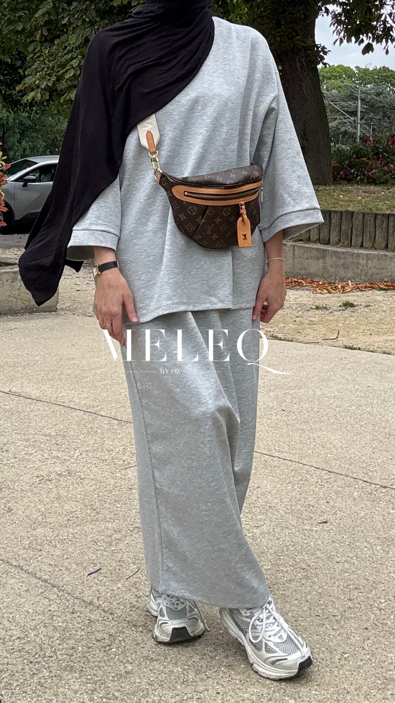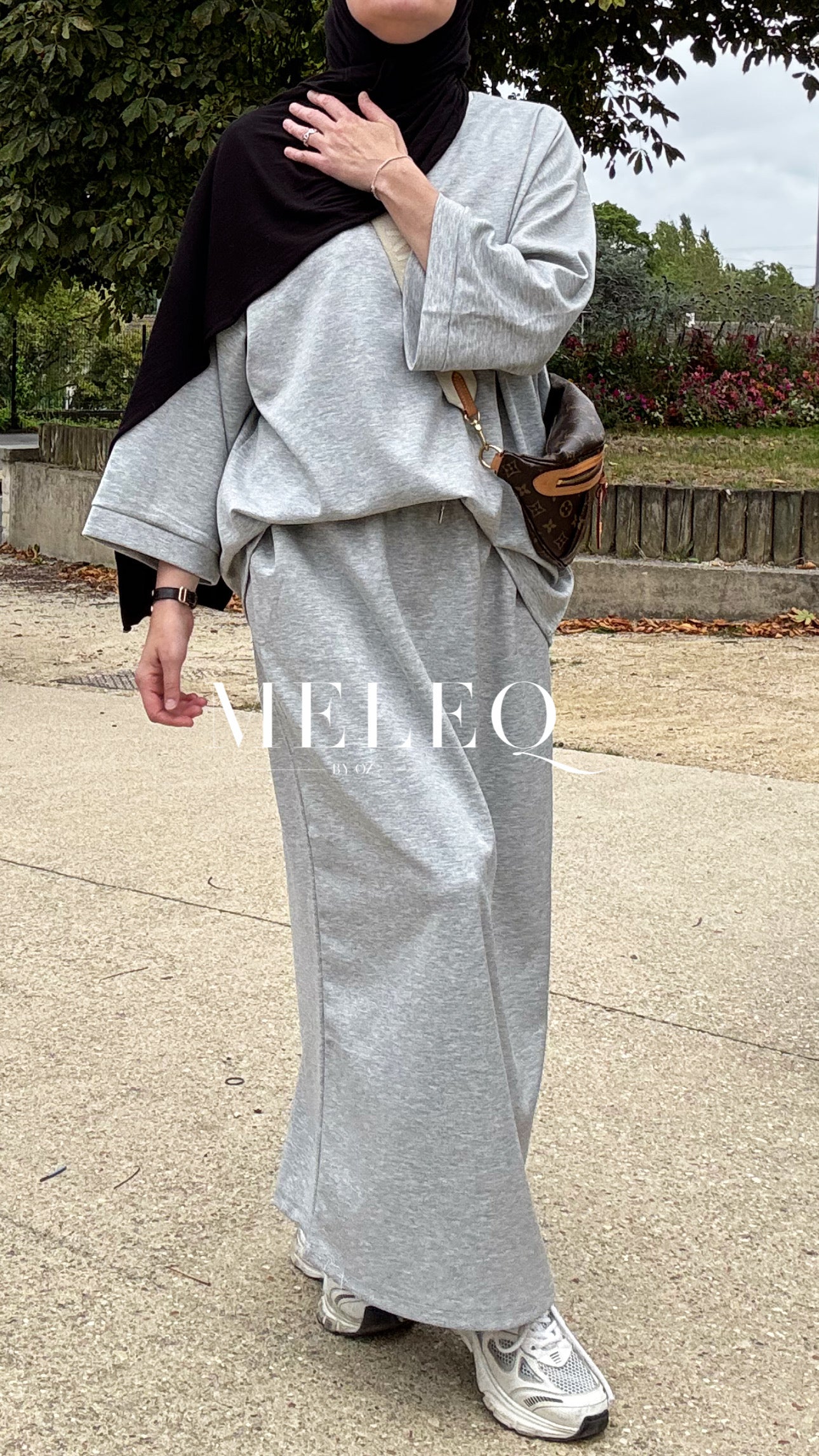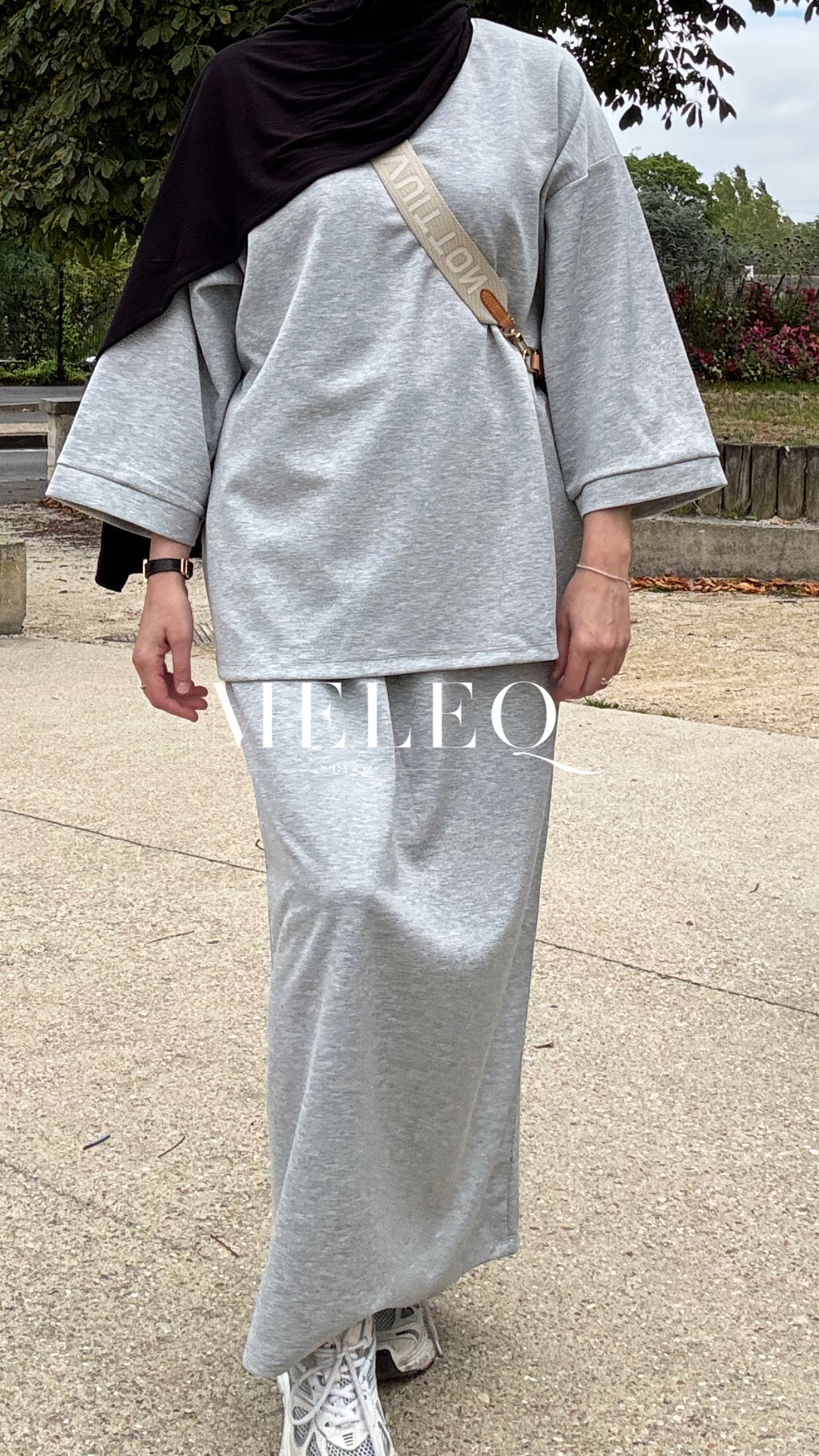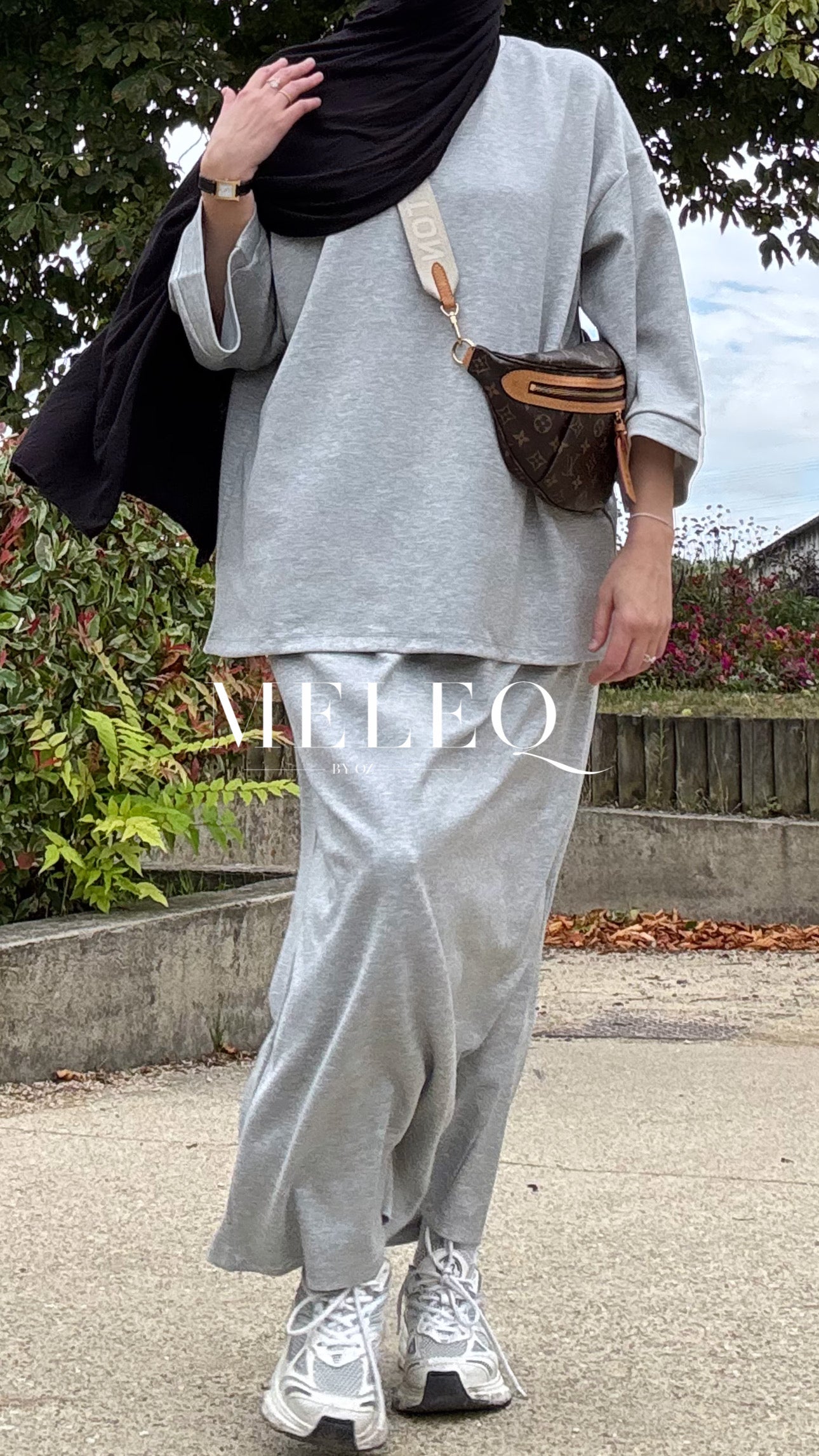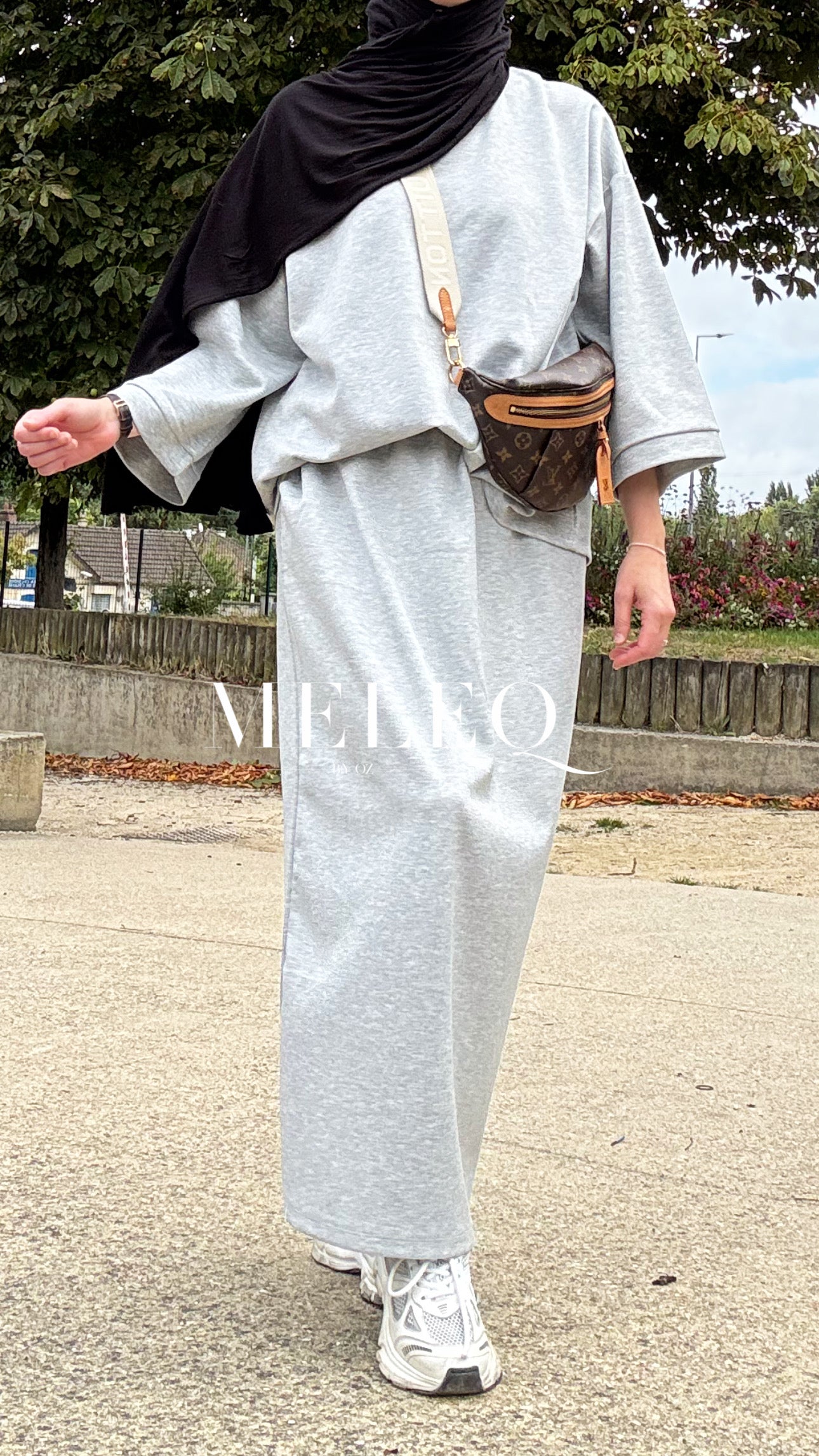 - Bas : Jupe longue style jogging, taille élastique pour un confort optimal et une liberté de mouvement.