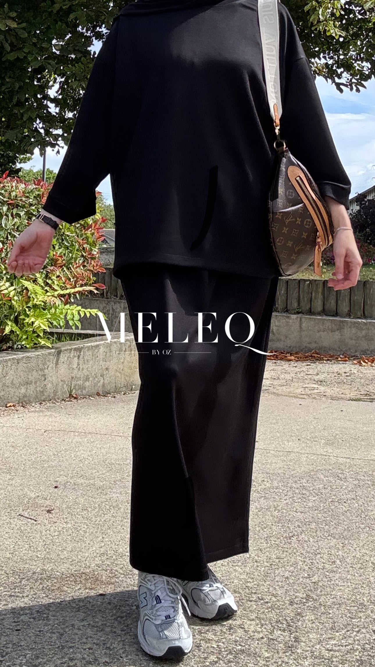 - Bas : Jupe longue style jogging, taille élastique pour un confort optimal et une liberté de mouvement.